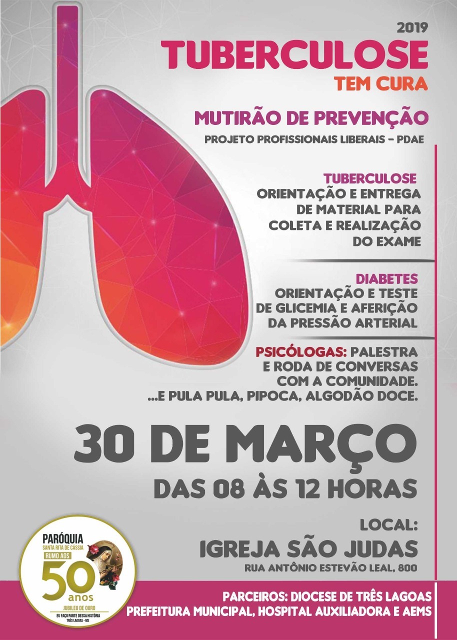 No próximo sábado (30) das 8h às 12h acontecerá o 1º Mutirão de Prevenção à Tuberculose, na Igreja São Judas, localizada a Rua Antônio Estavão Leal, nº 800 em Três Lagoas (MS).