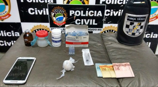 Os policiais militares integrantes da equipe de força tática de Aparecida do Taboado, unidos aos policiais civis daquele município, foram bem sucedidos na ação que culminou na prisão de mais um cidadão traficante de drogas! Durante patrulhamento pela cidade, os militares receberam a informação relativa a um cidadão sob a prática do tráfico de drogas. Imediatamente realizaram ação para localizá-lo! E foram bem sucedidos! Encontraram o cidadão denunciado! Com esse rapaz, maior de idade, foram encontrados vários materiais utilizados na produção de droga, além de considerável quantidade de substância análoga à cocaína!