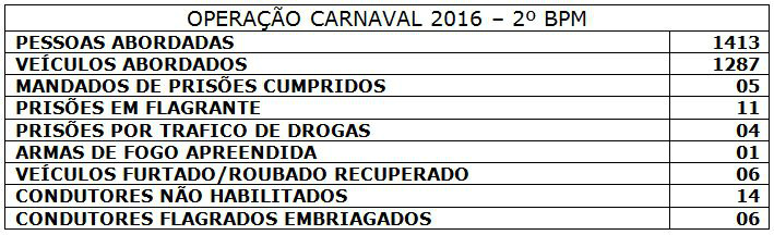 O 2º Batalhão de Policia Militar apresenta o resultado dos trabalhos realizados na operação carnaval de 2016, que aconteceu no período de 04 a 10 de fevereiro.
