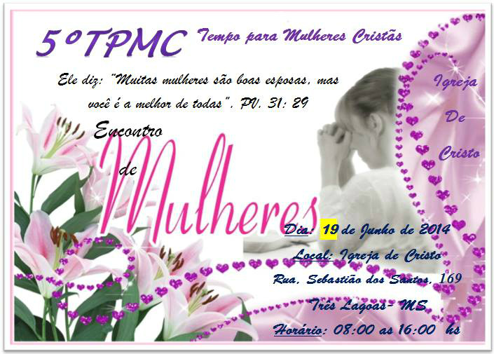 A Igreja de Cristo de Três Lagoas, convida às mulheres para um glorioso encontro das 08:00 até às 16:00 horas na Rua Sebastião dos Santos, N°169.