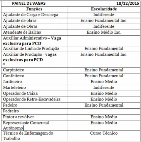 Confira as vagas: ajudante de obras, ajudante de carga e descarga, ajudante de obras, ajudante de balcão, auxiliar de linha de produção, carpinteiro, jardineiro, marteleteiro, operador de caixa, operador de reto-escavadeira, padeiro, pedreiro, pintor à revolver, representante comercial autonomo e técnico de enfermagem do trabalho.