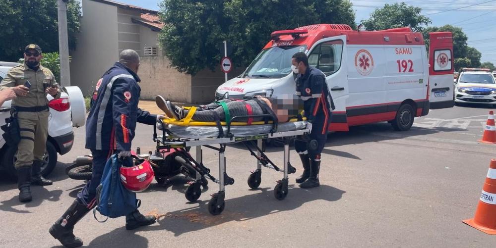 Mulher sofreu escoriações e foi socorrida por equipes do SAMU e Corpo de Bombeiros, onde motorista teria invadido a via preferencial.