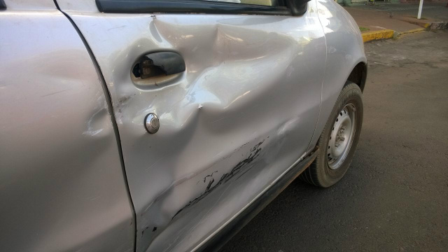 Em razão da colisão, a caminhonete amassou a porta esquerda do carro, mas ninguém se feriu. A mulher avaliou a situação como um livramento de Deus.