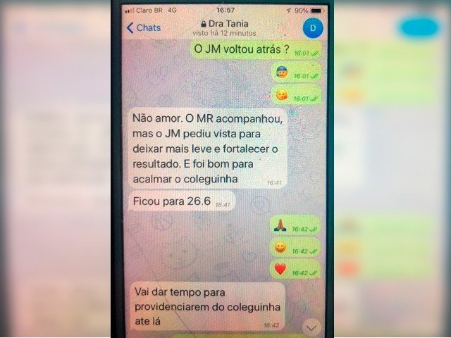 No dia 8 de maio, um novo diálogo entre Admilson e “Dra. Tânia”. Ele questiona se “JM” voltou atrás. A pessoa responde que “MR” acompanhou, mas “JM” pediu vista para deixar mais leve e fortalecer o resultado. Cita também que foi bom para acalmar o coleguinha e fico para 26.6.