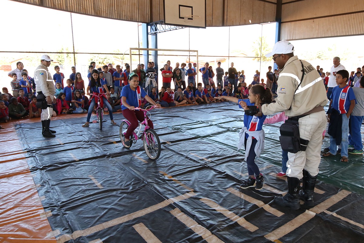 Ao percorrerem as vias, pilotando as bicicletas, as crianças eram orientadas pelos Agentes de Trânsito, a serem atentas à sinalização, especialmente, ao sinal de “PARE”, passagem de pedestres e respeito à via preferencial.