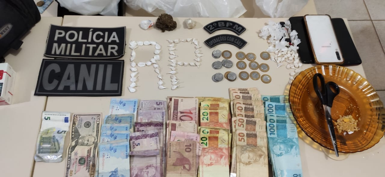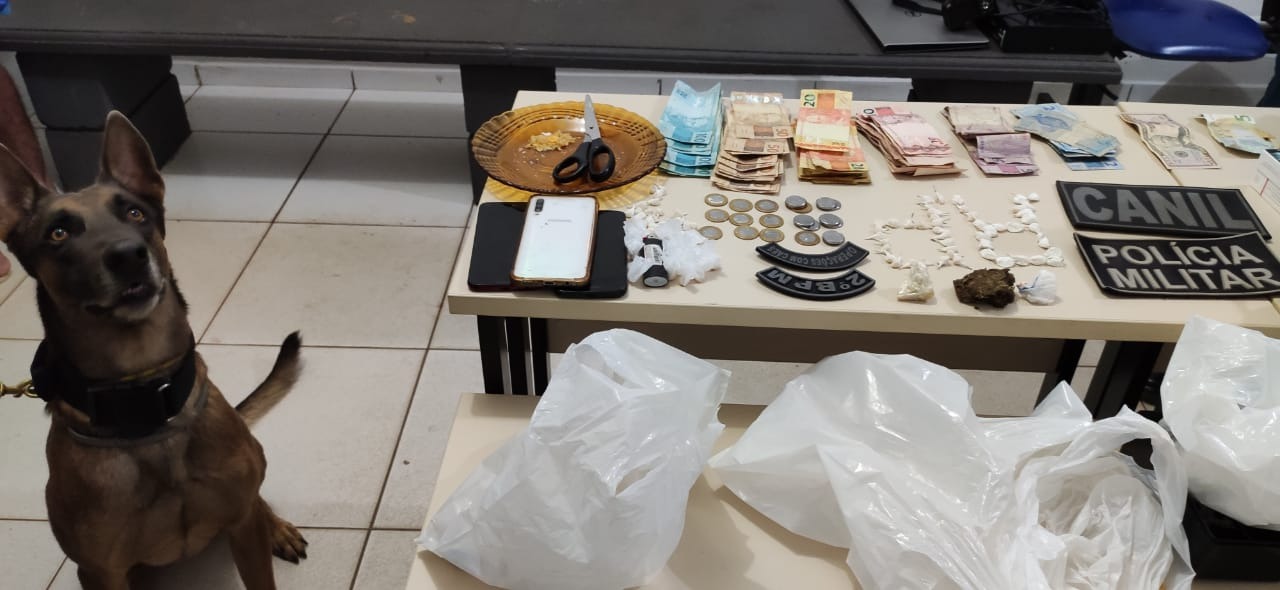 A ação foi realizada entre uma equipe operacional, o Serviço de Inteligência da PM e o Canil. Em buscas no imóvel, foram apreendidas trouxinhas de substâncias análogas a pasta base e cocaína.