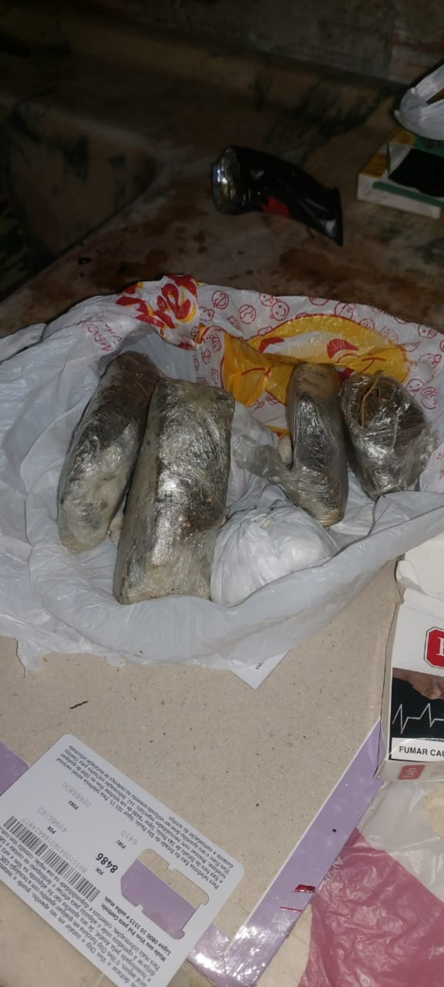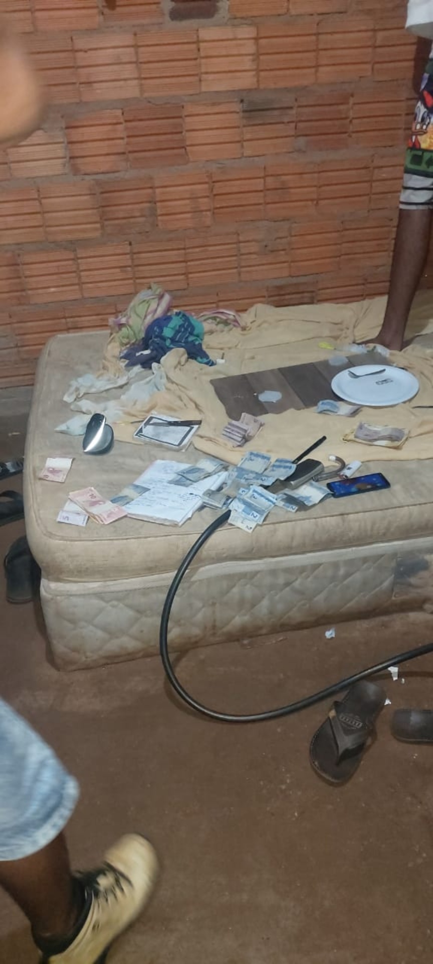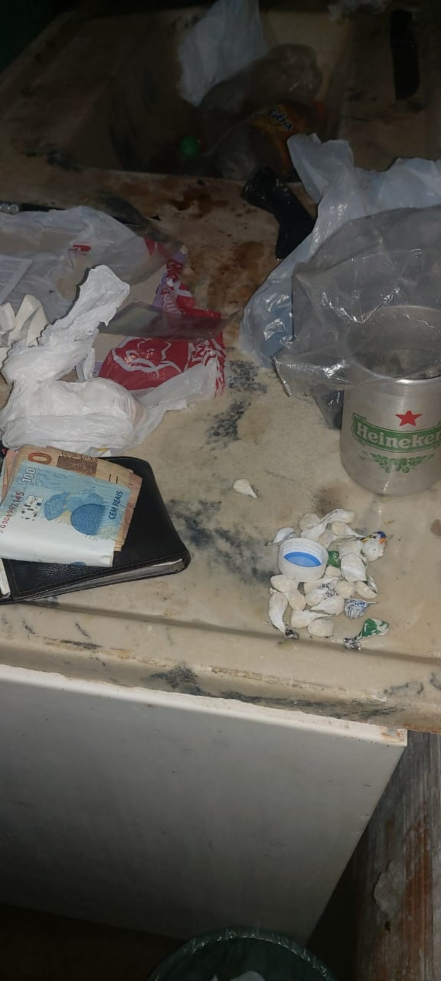 Em um primeiro contato com os ocupantes, foi localizado pela pia, dezenas de porções de crack, porções de maconha, dinheiro, cadernos de anotação e pedaços de sacolas picotadas para embalar entorpecente. Em cima de um colchão, foi localizada grande quantidade de dinheiro de diversos valores e uma balança de precisão, prato e instrumentos de corte. Pela casa, diversos outros entorpecentes foram encontrados.