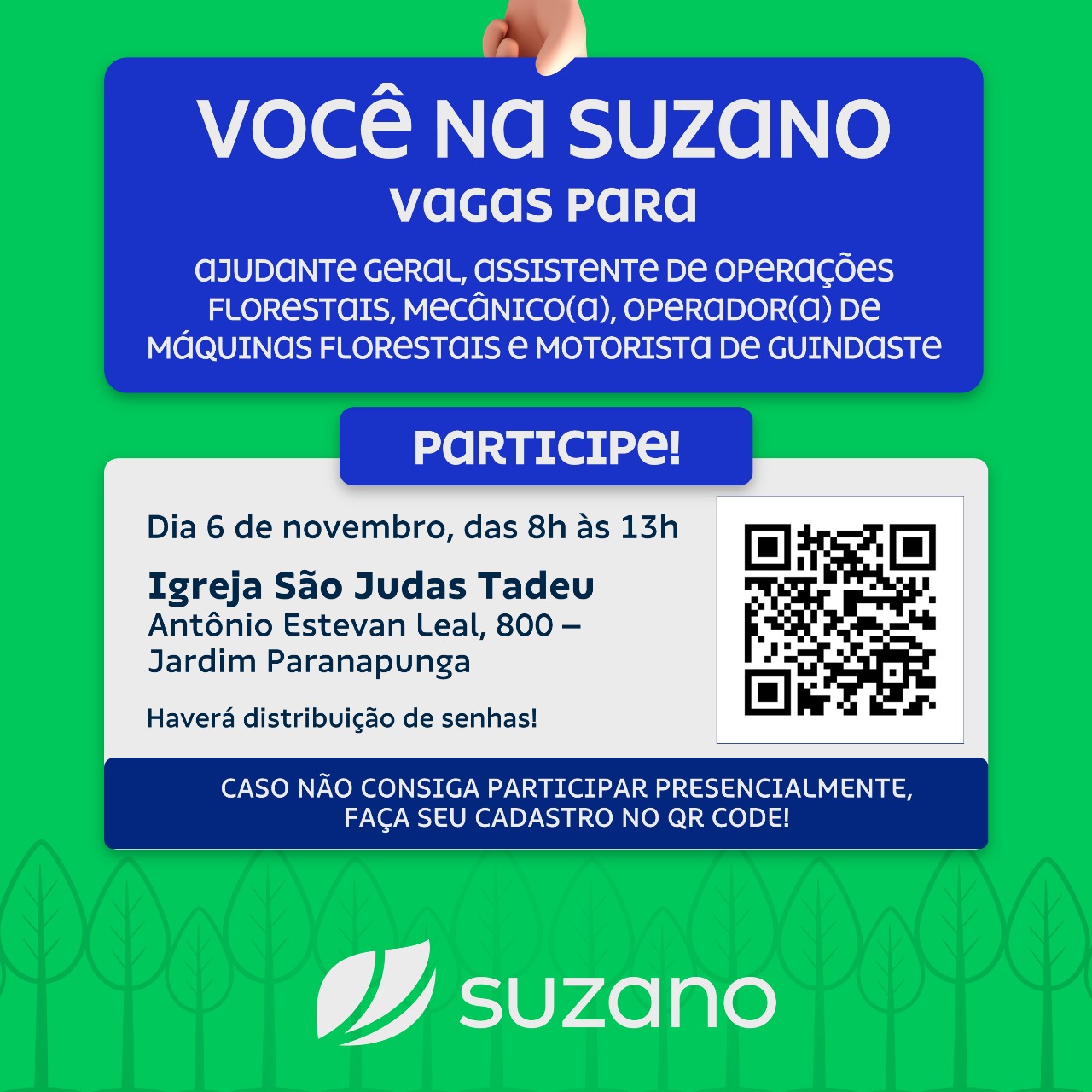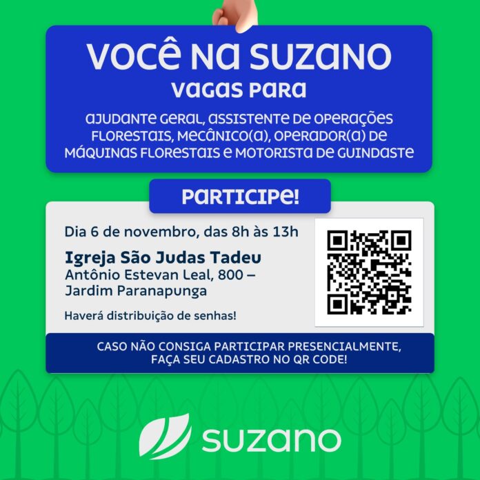 Depois de passar pelo bairro Vila Verde, a ação “Você na Suzano” será realizada no bairro Paranapungá, em Três Lagoas (MS). O evento, realizado pela Suzano, maior produtora mundial de celulose e referência global na fabricação de bioprodutos desenvolvidos a partir do eucalipto, tem como objetivo de cadastrar pessoas interessadas em atuar nas operações florestais da empresa e será realizado na próxima quarta-feira (6/11), das 8h às 13h, na Igreja São Judas Tadeu (Rua Antônio Estevan Leal, 800, Paranapungá).