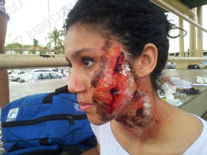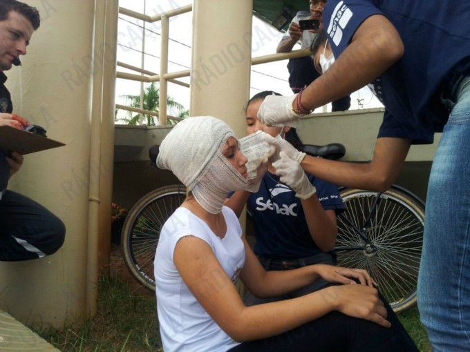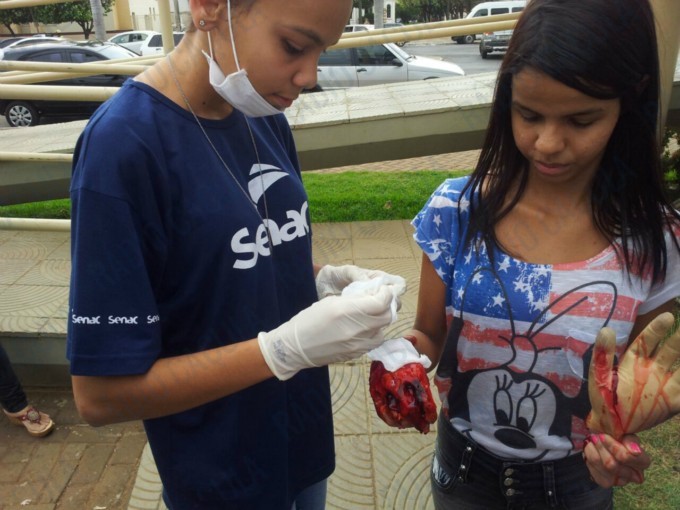 A simulação de um grave acidente com alunos maquiados chamou a atenção dos Três-lagoenses que passavam pelo local, os instrutores estavam dando uma aula prática de ações socorristas aos acidentados, pessoas que sofrem traumatismos, queimaduras e etc.