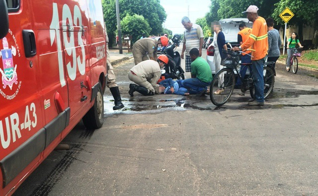 Devido à queda, a motociclista foi socorrida ao Hospital Auxiliadora com suspeitas de fraturas na clavícula e braço e perna direito. A motorista do carro permaneceu no local e prestou todos os atendimentos necessários a acidentada, que havia acabado de deixar a filha na escola.