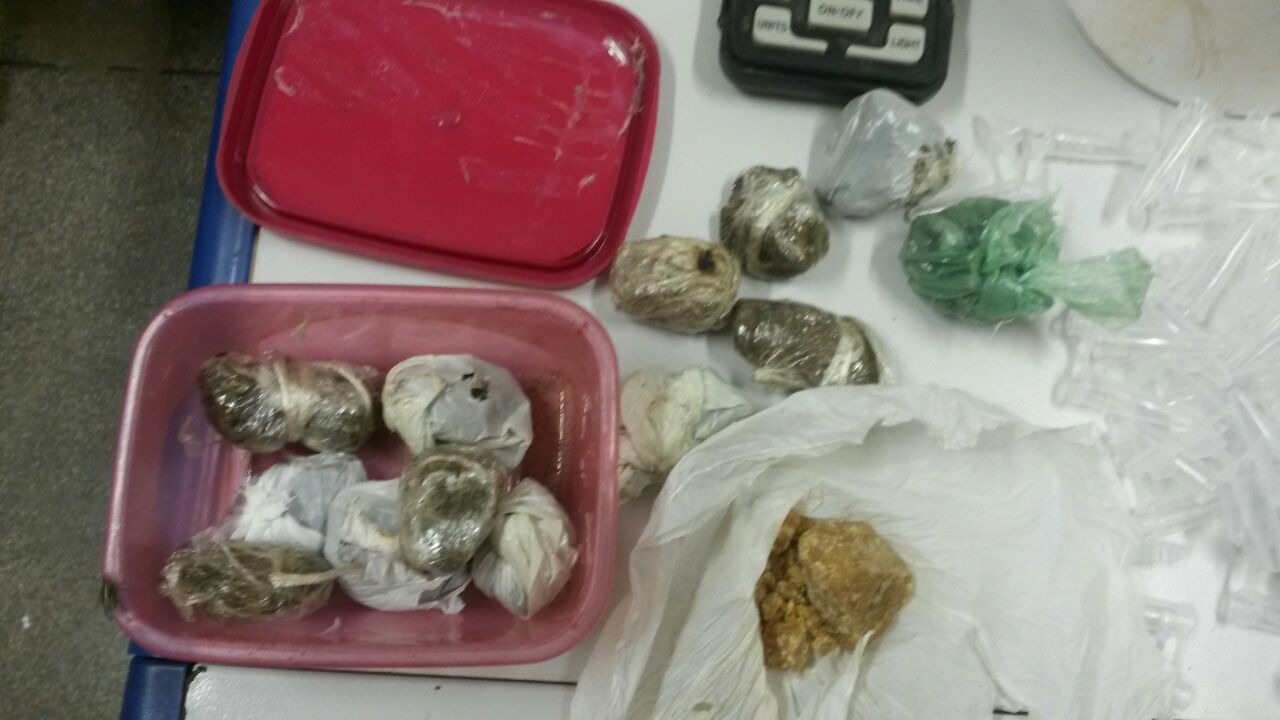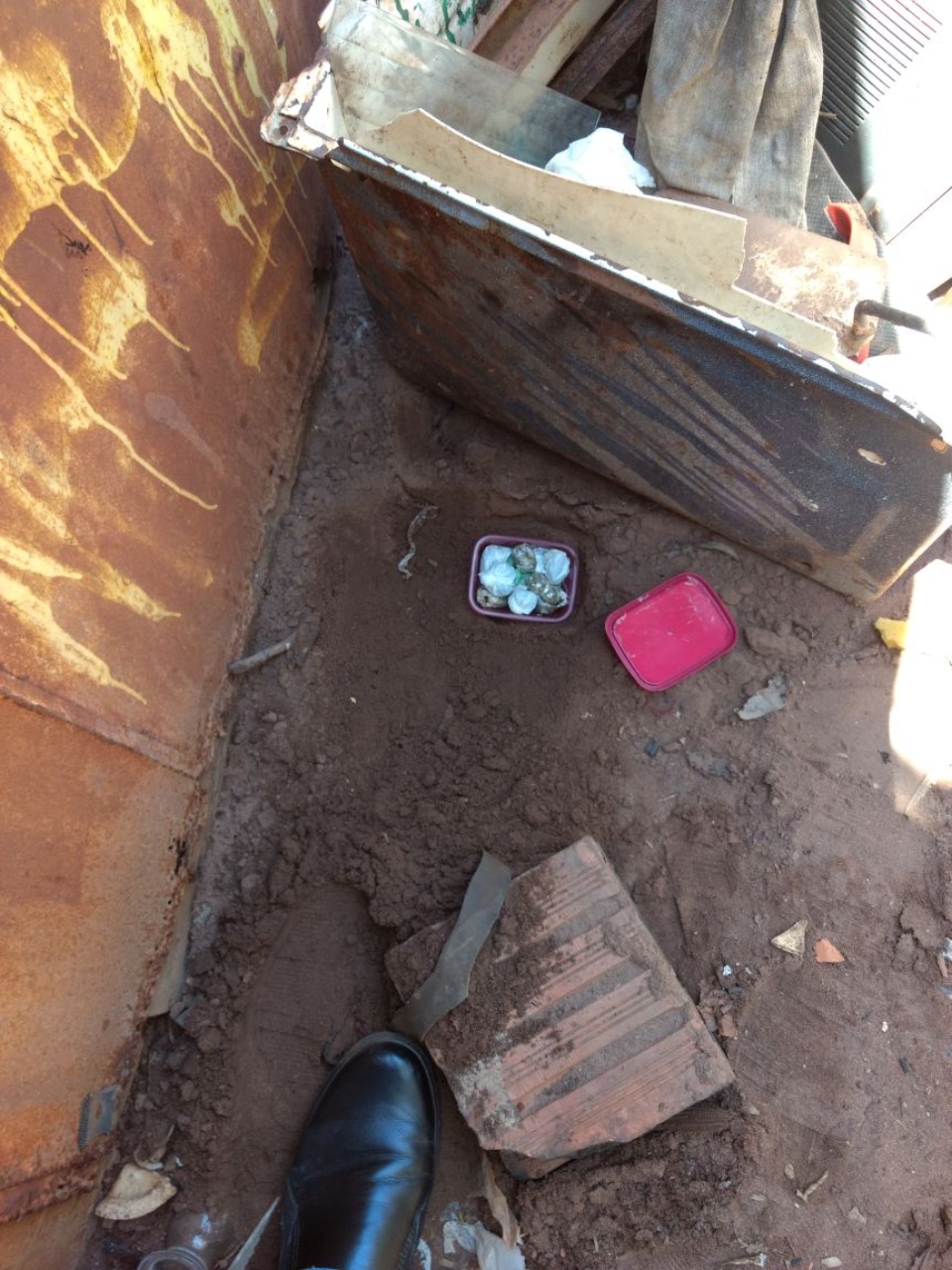 No quintal ainda foi encontrado em meio a um monte de entulho, uma trouxinha de maconha. Ainda no telhado da casa foi localizado outro recipiente, contendo 103 pinos vazios, prontos para serem preparados com entorpecentes.