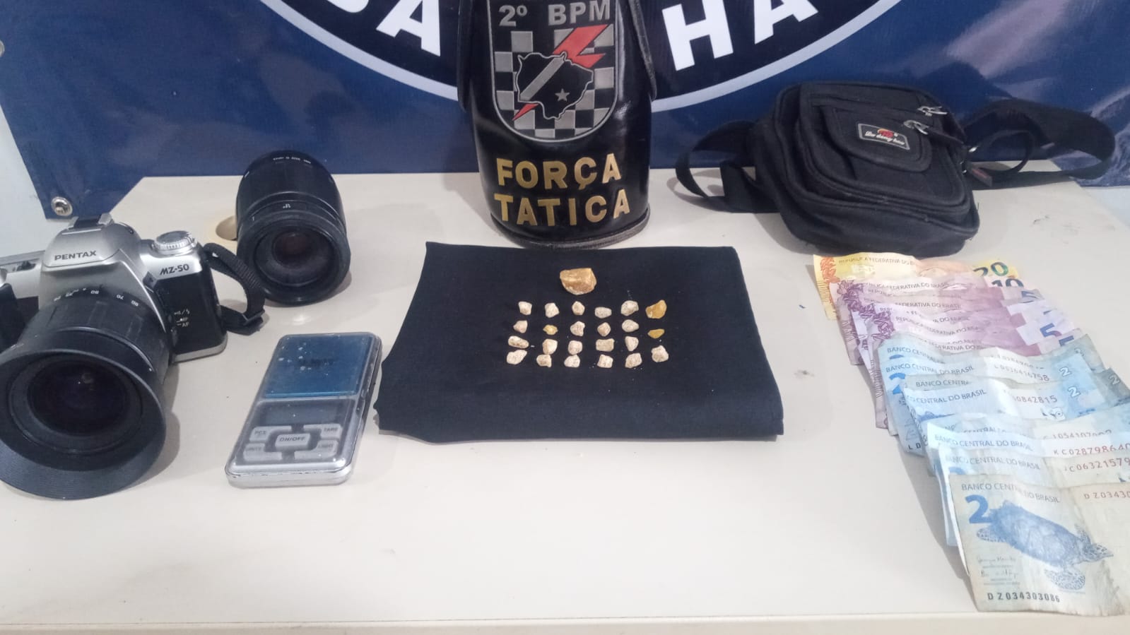 Diante da fundada suspeita, os policiais realizaram a abordagem e, durante a busca pessoal, localizaram 23 pedras de crack já fracionadas para venda, além de uma pedra maior da mesma substância, ainda não dividida, totalizando aproximadamente 9,7 gramas. Também foi apreendida uma câmera fotográfica, que, segundo o próprio abordado, teria sido recebida como forma de pagamento por entorpecentes.