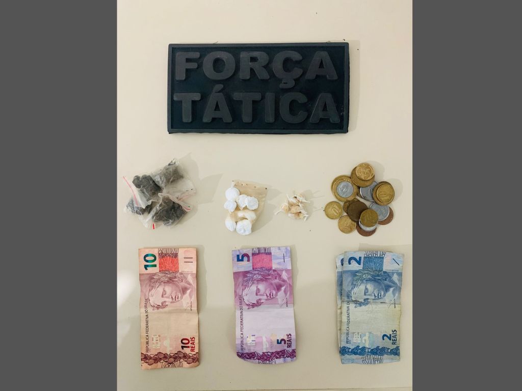 Ao perceberem a chegada da viatura, um dos adolescentes tentou esconder um objeto em um buraco da parede. Durante a busca, os policiais encontraram um embrulho com 4 porções de maconha, pesando 7,2 g, além de 6 porções de crack, pesando 1 g e 6 porções de cocaína, pesando 4,9 g.