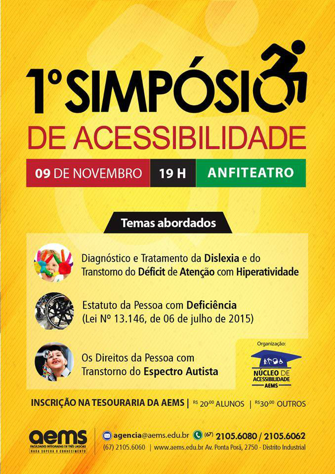 A equipe do Núcleo de Acessibilidade das Faculdades Integradas de Três Lagoas – AEMS, já está recebendo as inscrições dos interessados no I Simpósio de Acessibilidade, evento esse que irá ocorrer no dia 09 de novembro, às 19h00, no anfiteatro. Com direito a certificação de 10 horas, o Simpósio é inovador na cidade e irá contribuir para se pensar em assuntos como Dislexia, Estatuto da Pessoa com Deficiência, entre outros. As inscrições estão sendo feitas na secretaria da AEMS por R$ 20,00 para alunos. Já outros que tiverem interesse em participarem, R$ 30,00.