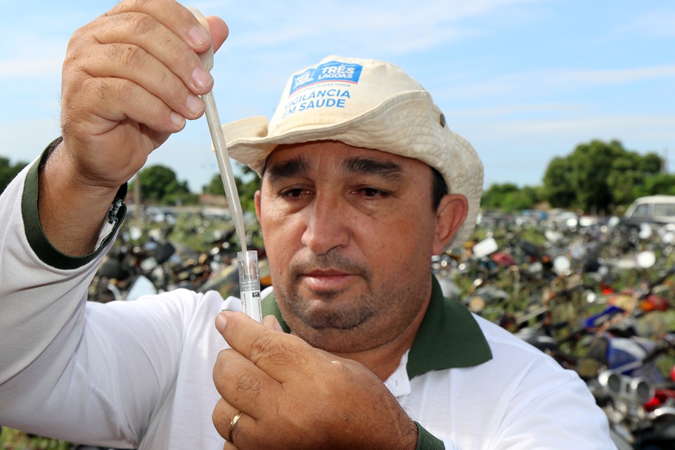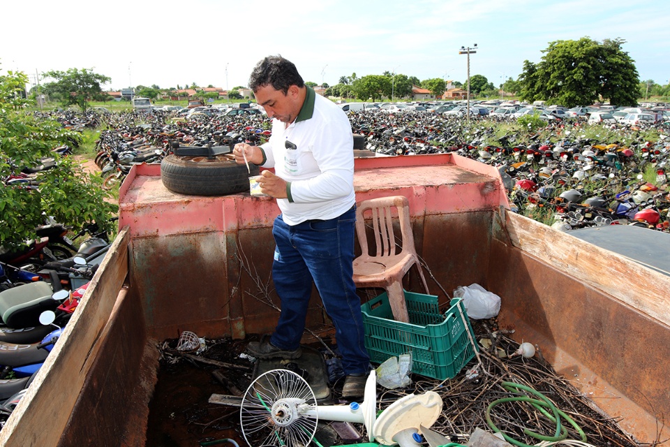 “Logo de cara, localizamos quatro focos criadouros com larvas do Aedes aegypti. Um deles foi encontrado em uma das inúmeras motocicletas que aqui estão depositadas”, mostrou Alcides.