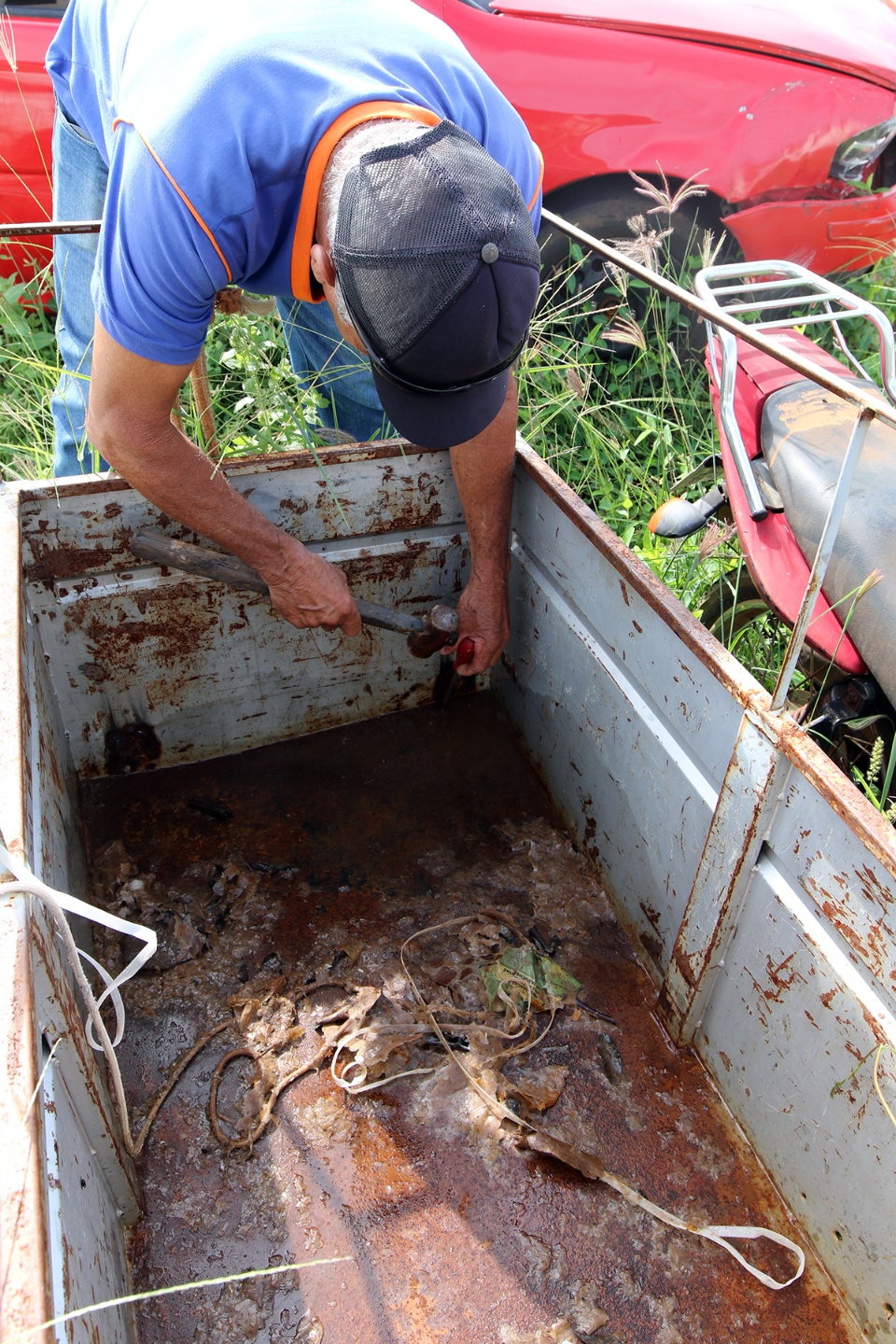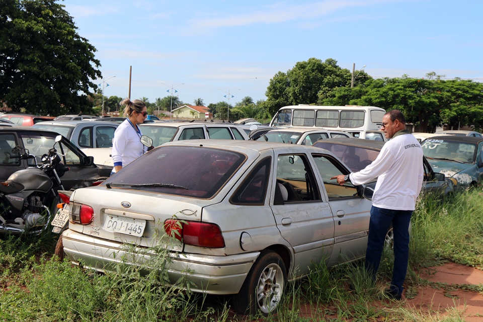 A equipe de Agentes de Endemias estava iniciando uma ação de “verdadeiro pente fino”, para localizar e eliminar os focos de Dengue, dentro e fora dos veículos apreendidos.