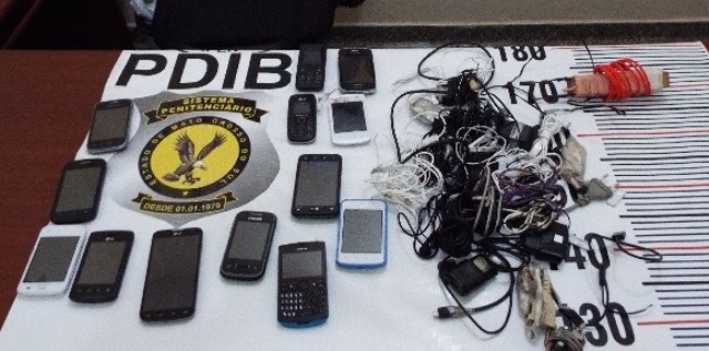 No domingo, por volta das 19h30min, durante ronda nas imediações da portaria, no pátio interno, foram localizadas duas caixas de leite contendo oito celulares, sete carregadores, nove chips e sete fones de ouvido.