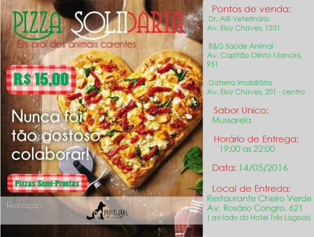 Diariamente, as protetoras recebem diversos pedidos de ajuda, mas para poder atender a todos estes animais da forma como merecem, é preciso ter recursos e por isso, agora é a vez dos três-lagoenses ajudarem as protetoras a ajudar e para isso é só participar do evento pizza solidária e com apenas R$15 você saboreia uma deliciosa pizza e ainda ajuda os cães e gatos do projeto.