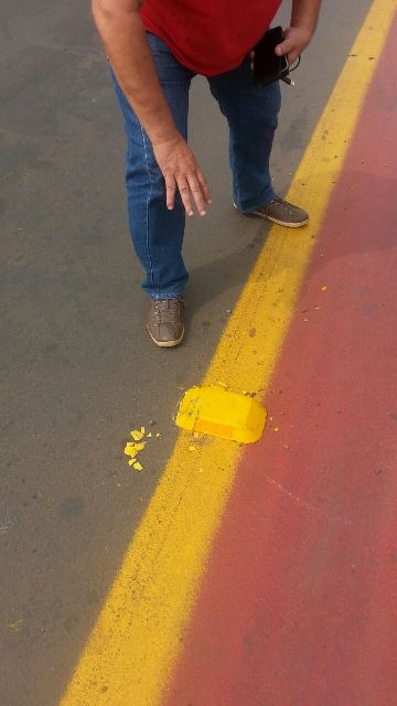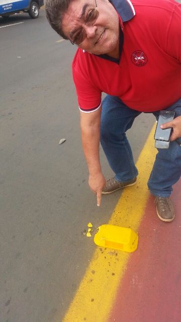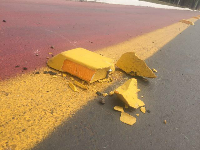 Os tachões instalados por toda a extensão da via foram fixados pelo centro, desconsiderando o desnível da pista e deixando a borda dos reflexivos afastada do solo, fator este que com a passagem de veículos pesados, forçam a sua base e provocam rachaduras.