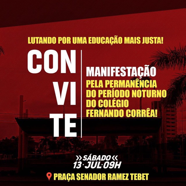 O protesto contra a transferência dos alunos do período noturno será realizado na Praça Senador “Ramez Tebet” a partir das 09h.