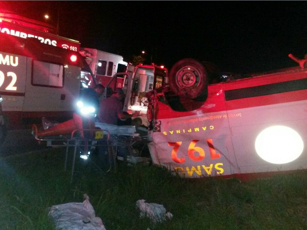 Uma ambulância do Samu foi atingida por um carro e capotou na madrugada deste domingo (13) na Rodovia Santos Dumont (SP-075), em Campinas (SP). O motorista do carro que provocou o acidente estava em alta velocidade e embriagado, de acordo com a Polícia Rodoviária. Três pessoas ficaram feridas, entre elas o condutor da ambulância, que foi socorrido em estado grave.