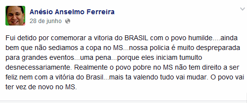 “Fui detido por comemorar a vitória do BRASIL com o povo humilde….ainda bem que não sediamos a copa no MS…nossa policia é muito despreparada para grandes eventos…uma pena…porque eles iniciam tumulto desnecessariamente. Realmente o povo pobre no MS não tem direito a ser feliz nem com a vitória do Brasil…mais está valendo tudo vai mudar. O povo vai ter vez de novo no MS”.