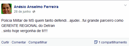 “Policia Militar de MS quem tanto defendi…ajudei…fui grande parceiro como GERENTE REGIONAL do Detran. ..sinto hoje vergonha de ti!!!”.