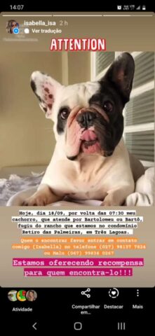 Neste domingo (18), por volta das 7:30 horas, um cachorro da raça Buldogue francês nas cores branco e preto, tipo pirata, com 2 anos desapareceu de uma residência, atende pelo nome de Bartolomeu, ele possui uma coleira peitoral preto e vermelha, os proprietários oferecem uma recompensa de R$1.000,00 reais.