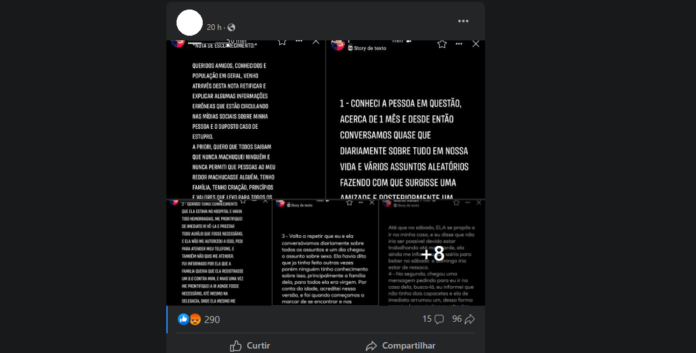 Em sua postagem, o suspeito, o qual vamos identificar somente com as iniciais M.R, declarou que conheceu a vítima há cerca de 1 mês, onde conversaram sobre vários assuntos, onde segundo ele, surgiu uma amizade e um “carinho especial” pela jovem. Quando Júlia estava no hospital, segundo o suspeito, teria se prontificado de imediato para dar todo o auxílio, mas ela não queria o atender. Ele teria sido informado também que a família da vítima queria registrar um boletim de ocorrência contra ele. Ainda durante a postagem, afirmou estar à disposição da Justiça para dar sua versão do caso. Nos comentários da publicação feita, o acusado também postou trechos de conversas que teve com a vítima pelo WhatsApp.