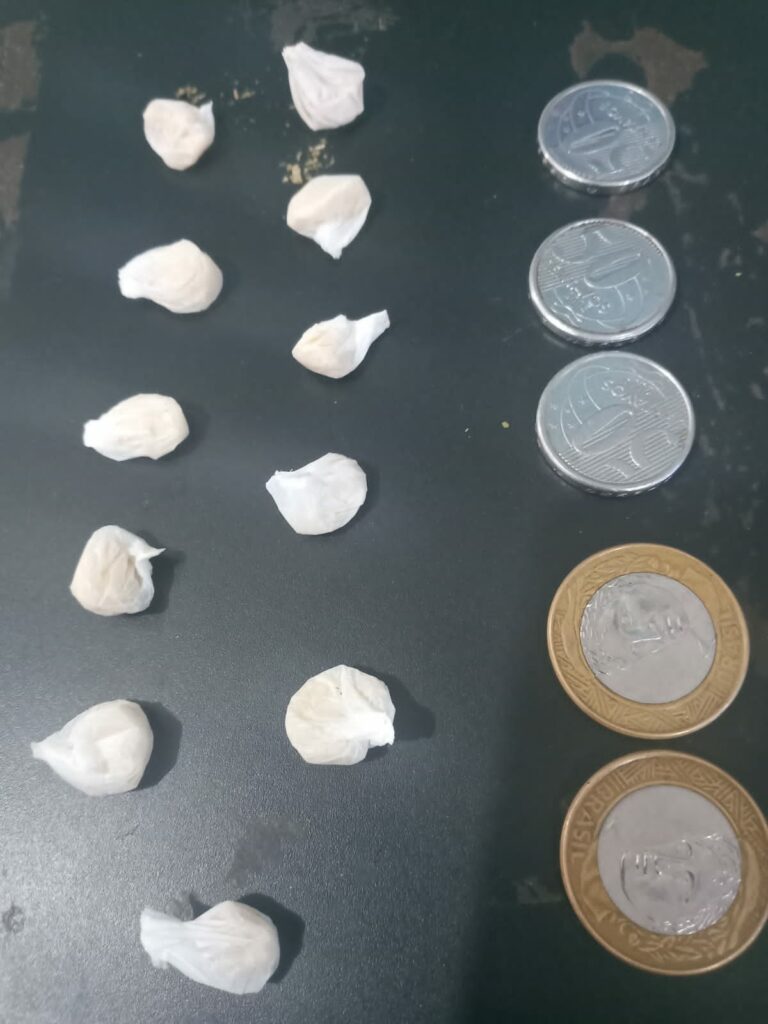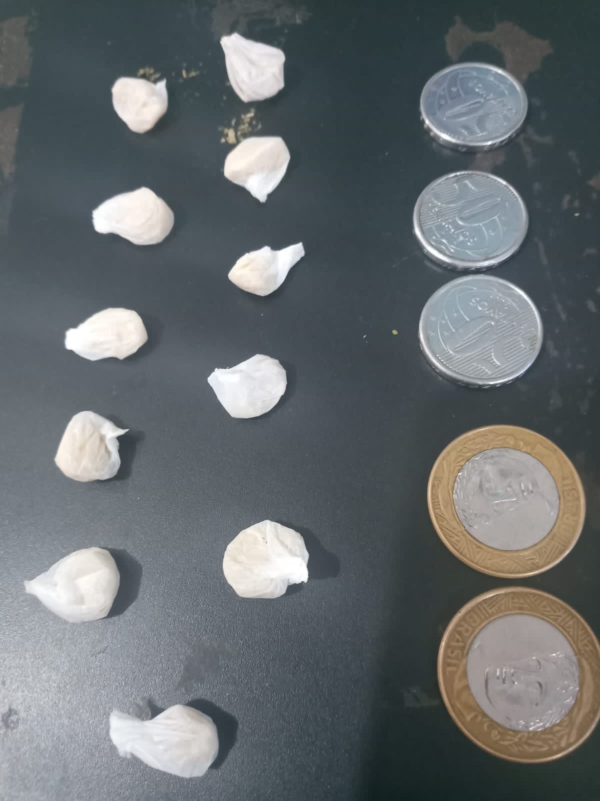 O suspeito que realizou a ameaça não acatou a ordem de parada da equipe, sendo acompanhado taticamente, e sendo abordado no cruzamento das ruas Irmãos Cameshi com a rua Das Seriemas. Em busca pessoal no rapaz, foi encontrado 11 embalagens de crack em sua bermuda, além de R$ 3,50 em dinheiro.