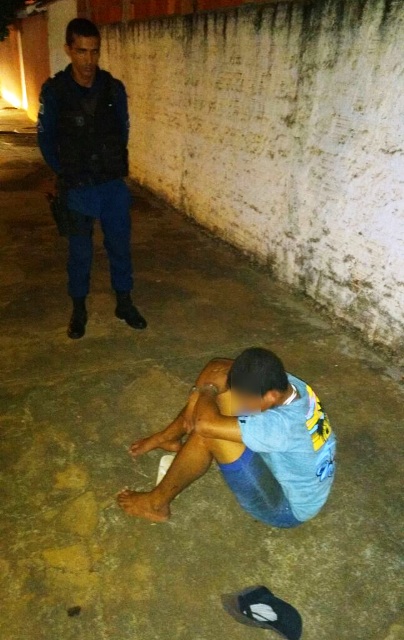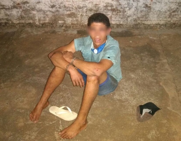Os militares iniciaram as diligências na direção apontada como sendo a de fuga e logo avistaram um dos suspeitos correndo em uma bicicleta na rua Amilcar Congro Bastos. O acusado ainda tentou fugir adentrando nas casas e pulando muros, no entanto, a guarnição fechou um dos quarteirões localizando e abordando o rapaz.