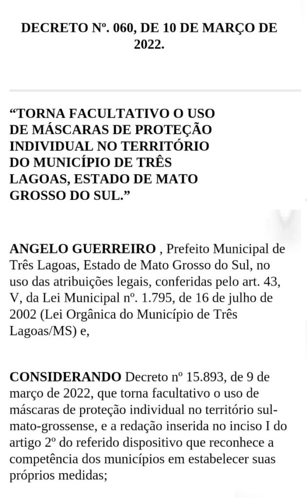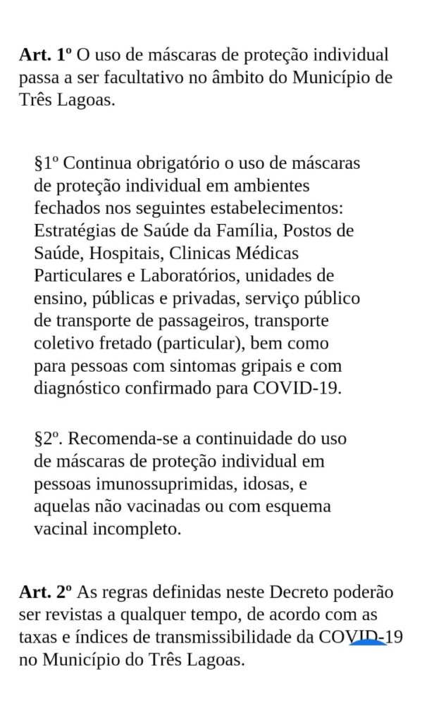 Com isso, o uso de máscaras de proteção individual passa a ser facultativo no município de Três Lagoas (MS).