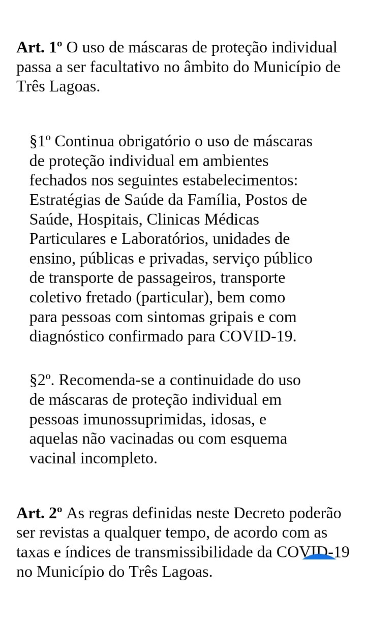 Com isso, o uso de máscaras de proteção individual passa a ser facultativo no município de Três Lagoas (MS).