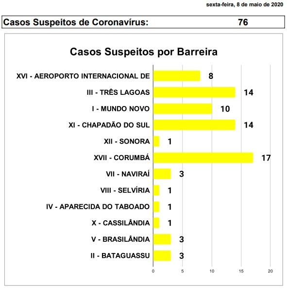 Até esta sexta (8), 76 pessoas foram notificadas como suspeitas para a Covid-19 nas barreiras sanitárias, sendo: 8 casos no Aeroporto Internacional de Campo Grande, 14 casos em Três Lagoas, 10 casos em Mundo Novo, 14 casos em Chapadão do Sul, 17 casos em Corumbá. Naviraí, Brasilândia e Bataguassu registraram cada uma 3 casos. Sonora, Selvíria, Aparecido do Taboado e Cassilândia registraram 1 caso cada.