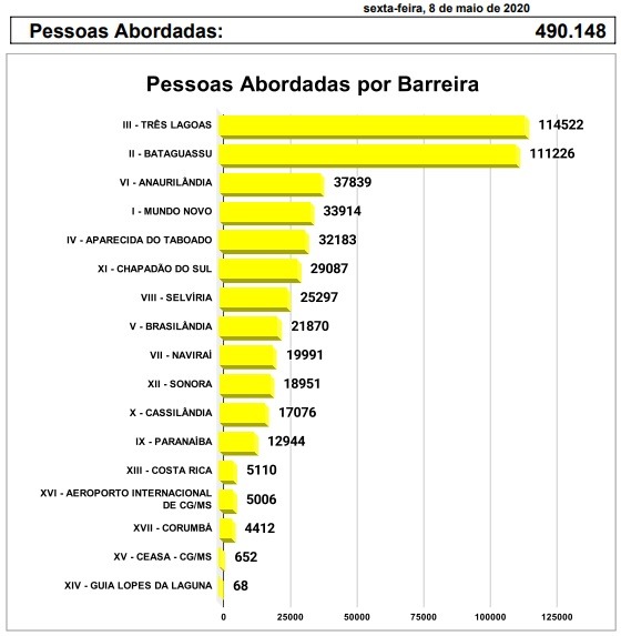 Na somatória de abordagens das 17 barreiras montadas em todo o Estado de MS, Três Lagoas (MS) continua como a primeira no ranking na quantidade de pessoas e veículos abordados. No acumulado, até momento, 114.522 pessoas e 54.846 meios de transportes foram abordados.