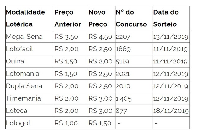 BRASIL – Os preços das apostas de oito modalidades lotéricas ficaram mais caros a partir de hoje (10). Segundo a Caixa Econômica Federal, o reajuste foi feito, após quatro anos sem elevação dos preços. Os novos valores foram autorizados pela Portaria nº 8.061 do Ministério da Economia, publicada no Diário Oficial da União no último dia 31 de outubro. O reajuste valerá para os sorteios que serão realizados a partir desta segunda-feira (11). Os novos preços serão os mesmos em todos os canais de apostas.
