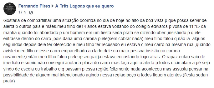 Três Lagoas (MS) – Na manhã desta quarta-feira (08) por redes sociais, Fernando Pires relatou que seu filho de 14 anos foi abordado no Alto da Boa Vista, retornando do colégio “ Edwards” às 11h15 min.