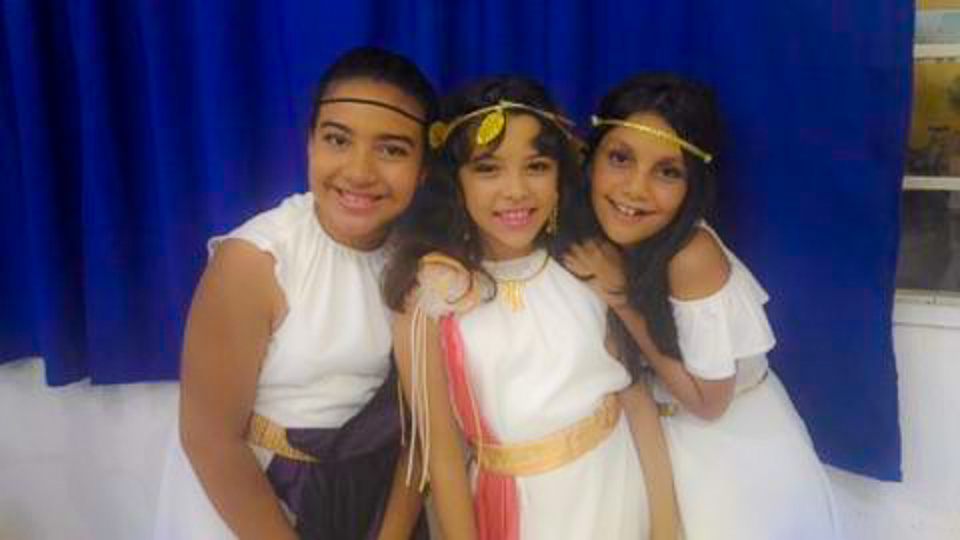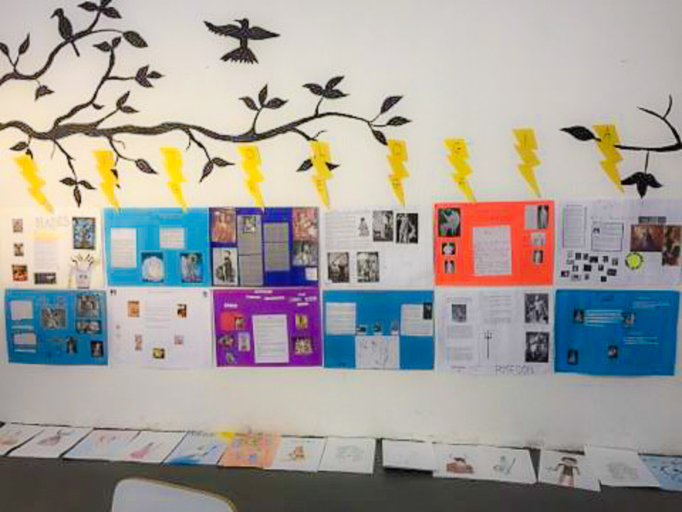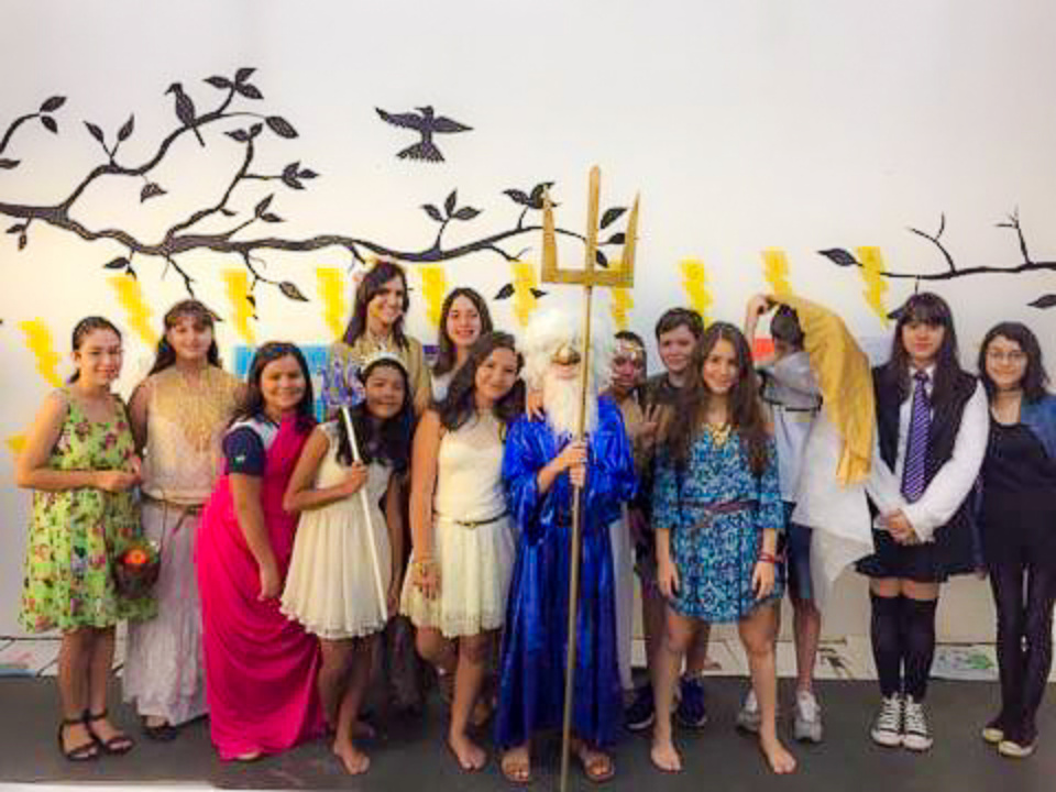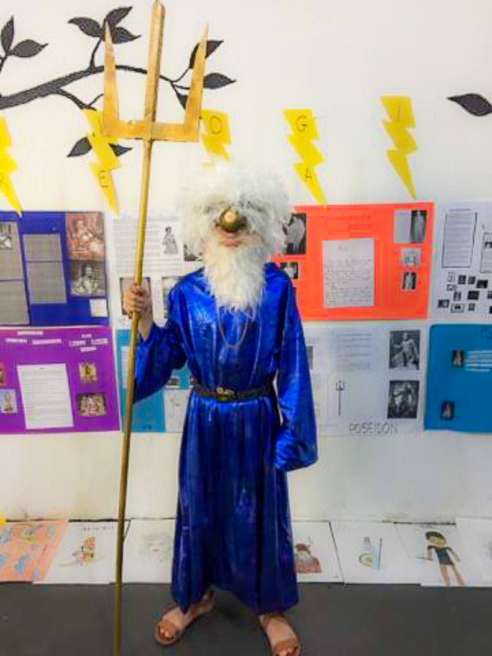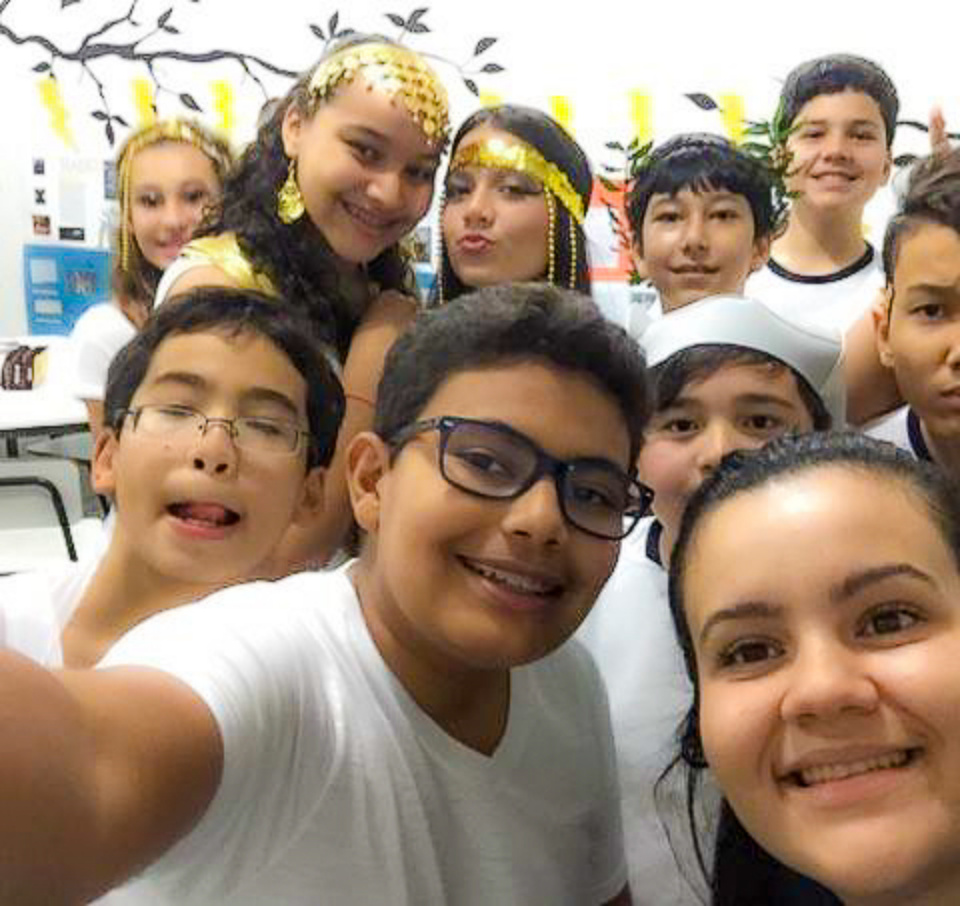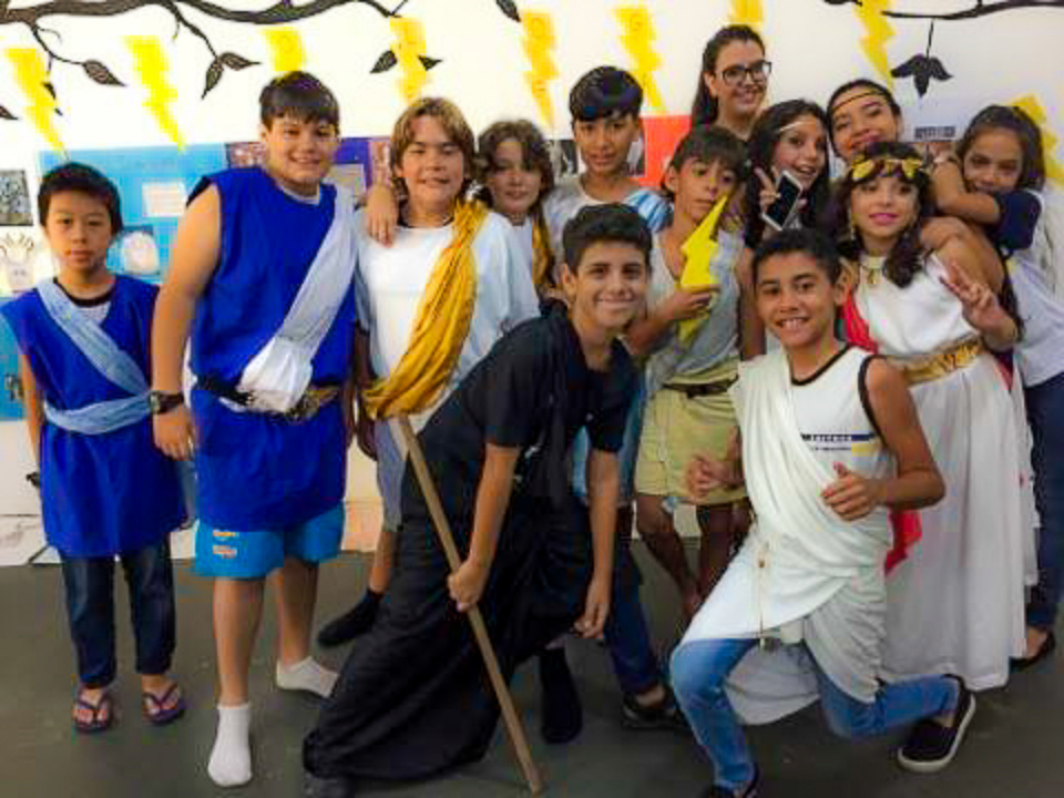 Outra temática desenvolvida com estes adolescentes foi sobre a mitologia grega, na qual os alunos desenvolveram a apresentação de histórias e desenhos artísticos sobre elas. A professora contou que é muito bom poder contar com recursos didáticos, como por exemplo, o laboratório de artes, planejado justamente para atividades como essas desenvolvidas por ela.