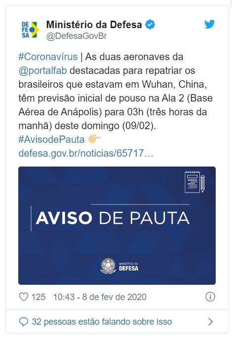 BRASIL – Os dois aviões da Força Aérea Brasileira (FAB) que trazem os brasileiros de Wuhan, na China, epicentro do surto mundial do coronavírus, e cidadãos de outros países têm previsão de pouso na Base Aérea de Anápolis, em Goiás, às 3h deste domingo (9). A informação foi divulgada há pouco pelo Ministério da Defesa no Twitter.