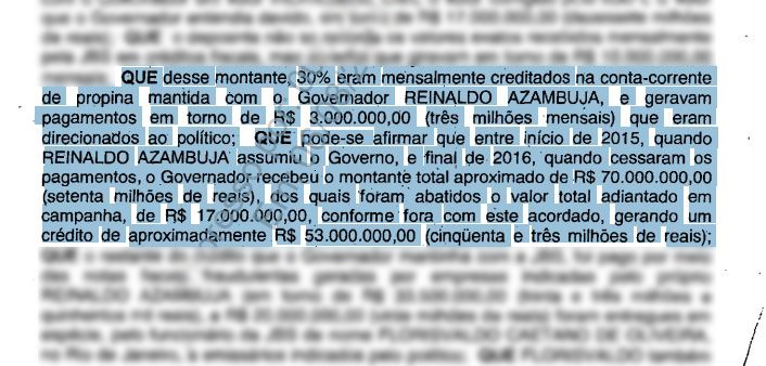 Em depoimento para a Polícia Federal, o empresário Wesley Batista, um dos donos da JBS, revelou que a propina paga ao governador de Mato Grosso do Sul, Reinaldo Azambuja (PSDB), candidato à reeleição, chegou a R$ 70 milhões entre o começo de 2015 e final de 2016. As declarações foram feitas durante a investigação criminal que apurou a efetividade da delação que abalou o país em maio de 2017.