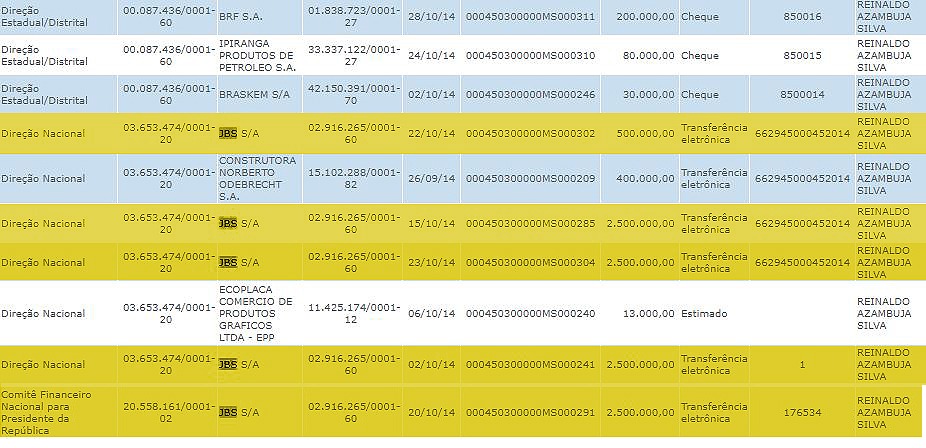 Já Wesley declarou ao delegado da Polícia Federal que fez quatro pagamentos, em dinheiro vivo, cada um no valor de R$ 2,5 milhões, “nos dias 02/10/14, 14/10/14, 17/10/14 e 21/10/14; QUE todas as doações de campanha da JBS a REINALDO AZAMBUJA, pelo que é de conhecimento do depoente, se deram em espécie, não tendo ocorrido doações oficiais”.