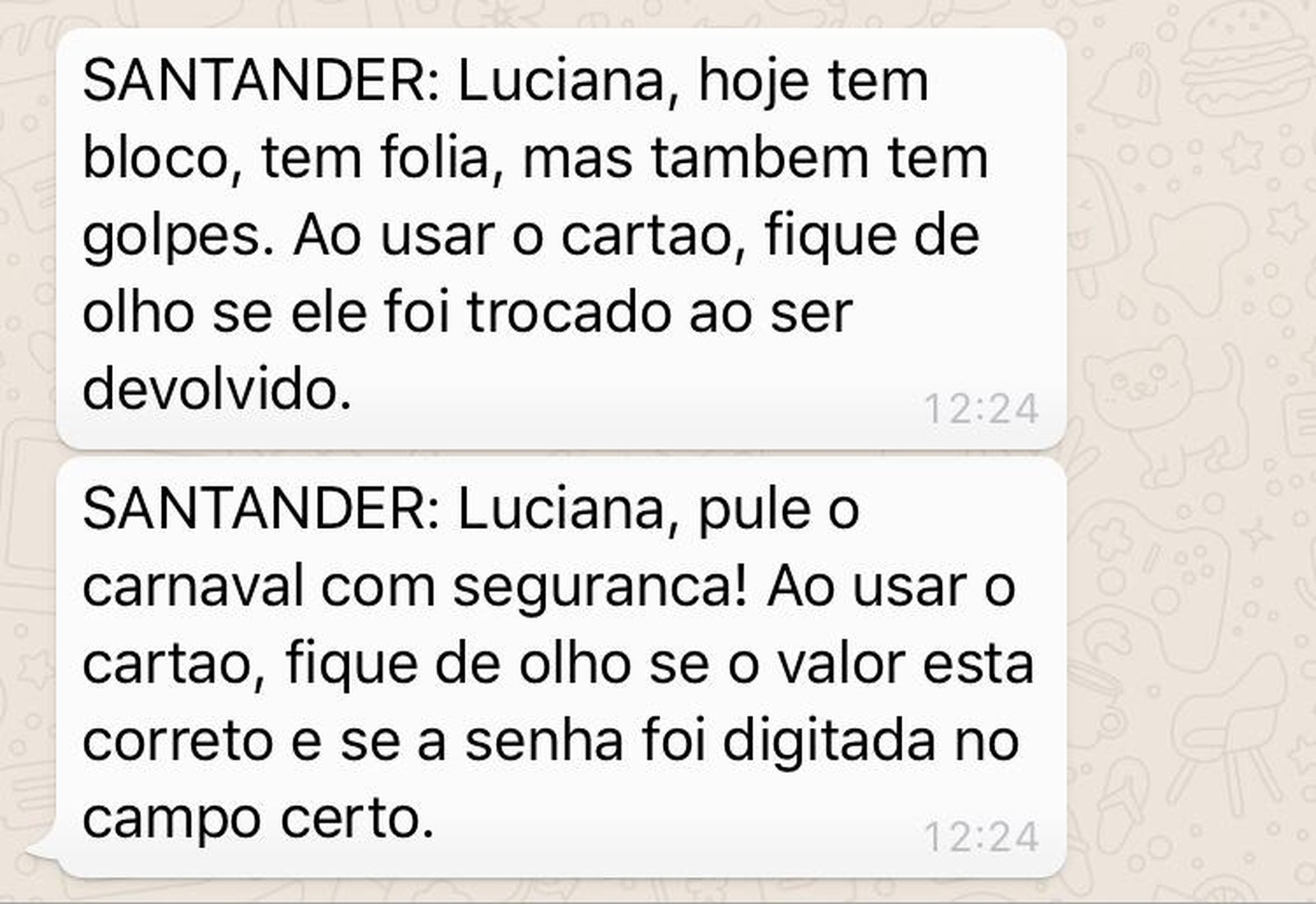 Outra fraude comum nos festejos é a compra dupla, segundo o Santander. No caso, o vendedor finge que o cartão não passou e pede para você digitar a senha novamente, em outra máquina. Para evitar o golpe, o banco alerta para prestar atenção à mensagem que aparece no visor.