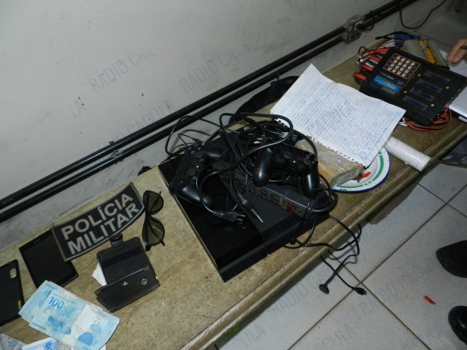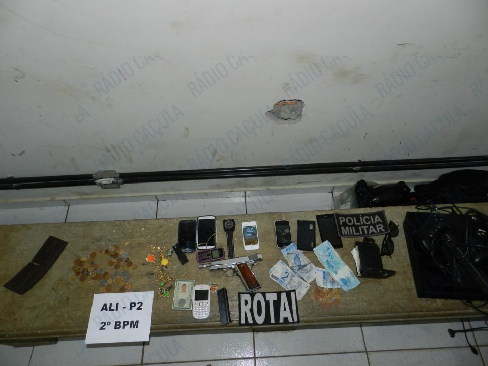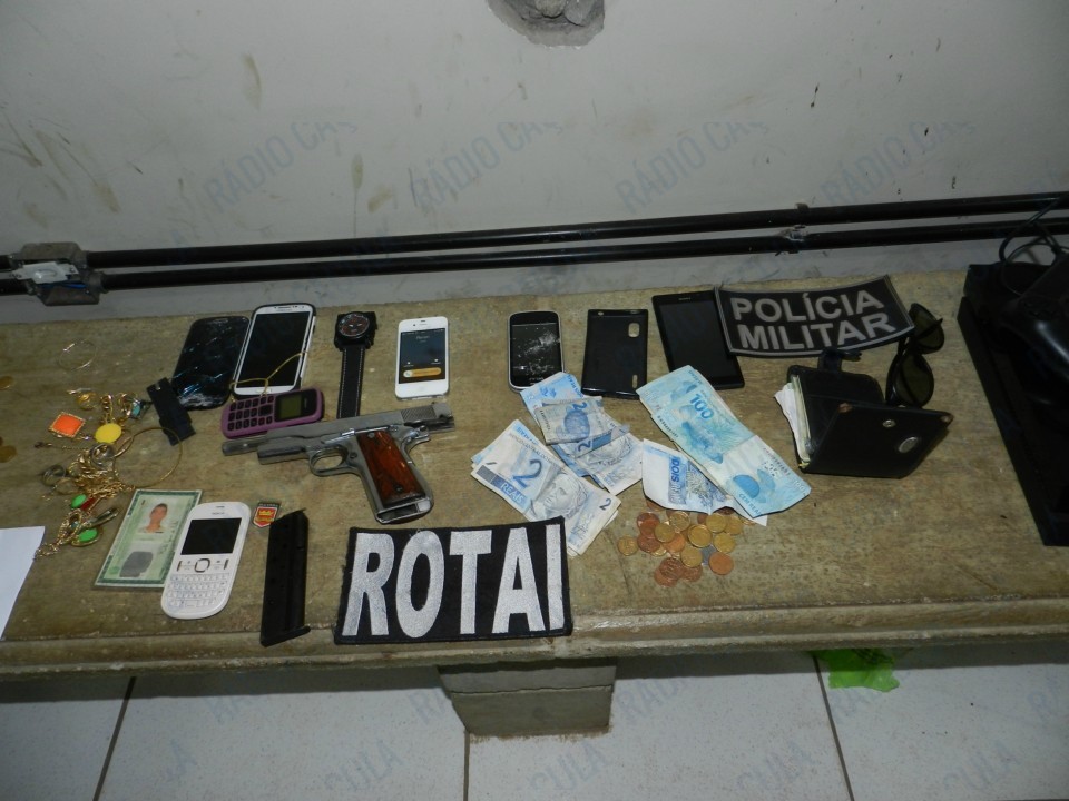 Na abordagem, à residência localizada na Rua Alceu Silva, foram localizados os dois acusados, eles negaram o fato, mas nas averiguações foram encontrados celulares, drogas, dinheiro, aparelhos eletrônicos e uma Pistola 380 (armamento pesado, usado no assalto).