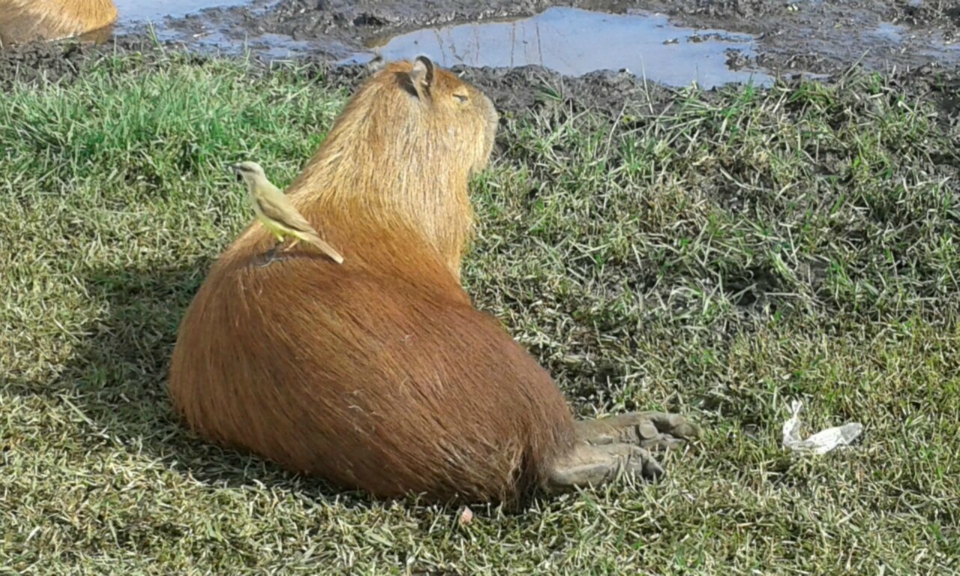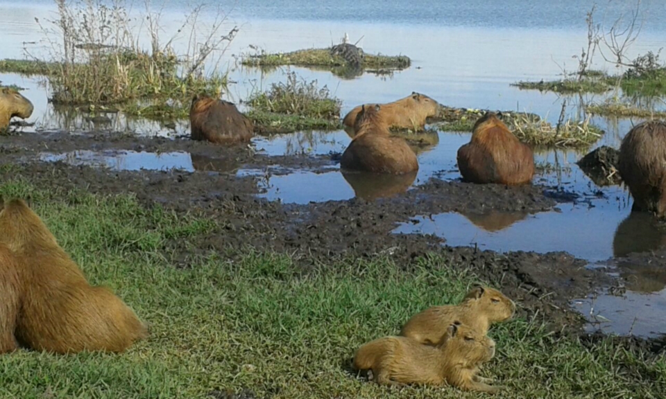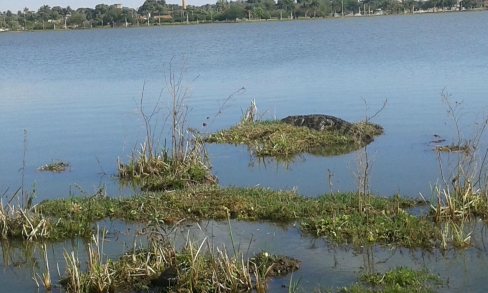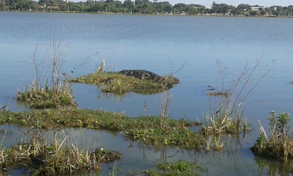 Foi assim que agora a pouco a equipe de Jornalismo da Rádio Caçula flagrou o jacaré tomando sol em uma ilhota. De costas para o bando de capivaras, permaneceu indiferente à presa, mas ligado no calor do Astro Rei.