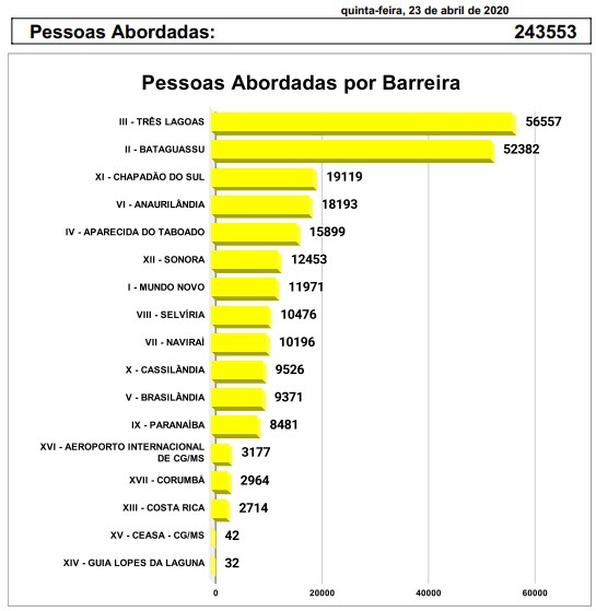 Segundo o boletim divulgado, na somatória de abordagens das 17 barreiras montadas em todo o Estado de MS, Três Lagoas (MS) continua como a primeira no ranking na quantidade de pessoas e veículos abordados