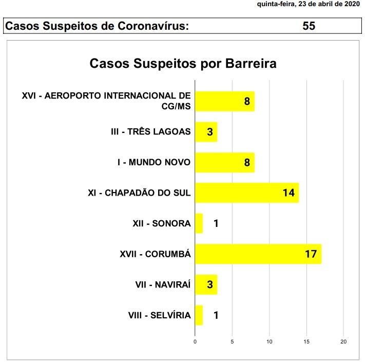 Segundo o boletim, até esta quinta, a Barreira Sanitária notificou como suspeitas para Covid-19 cerca de 55 pessoas, sendo: 17 casos suspeitos em Corumbá, 14 casos em Chapadão do Sul, 8 casos no Aeroporto Internacional de CG/MS, 8 casos em Mundo Novo, 3 casos em Três Lagoas, 3 em Naviraí e em Naviraí e Selvíria um caso cada.