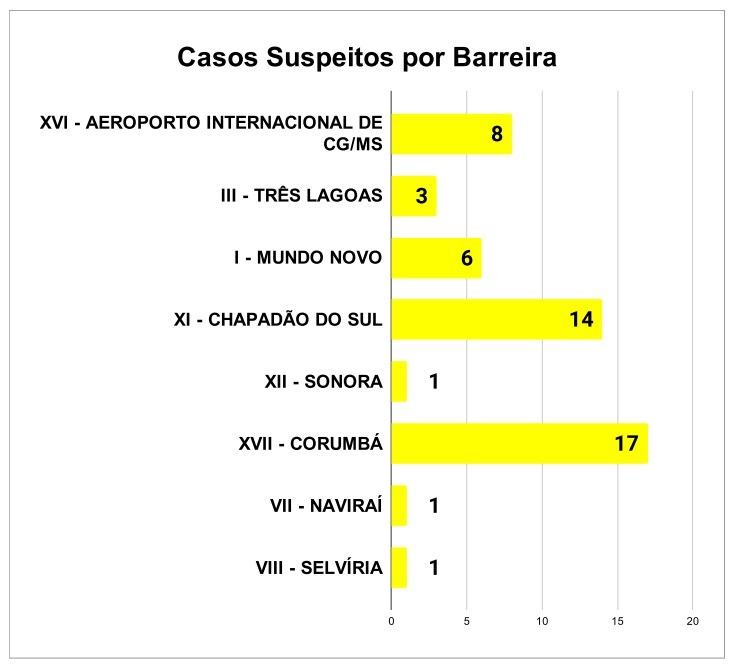 Segundo o boletim, até este sábado, a Barreira Sanitária notificou como suspeitas para Covid-19 cerca de 51 pessoas, sendo: 17 casos suspeitos em Corumbá, 14 casos em Chapadão do Sul, 8 casos no Aeroporto Internacional de CG/MS, 6 casos em Mundo Novo, 3 casos em Três Lagoas, e em Sonora, Corumbá, Naviraí e Selvíria um caso cada.