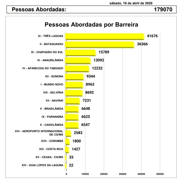Segundo o boletim divulgado, na somatória de abordagens das 17 barreiras montadas em todo o Estado de MS, Três Lagoas (MS) continua como a primeira no ranking na quantidade de pessoas e veículos abordados.