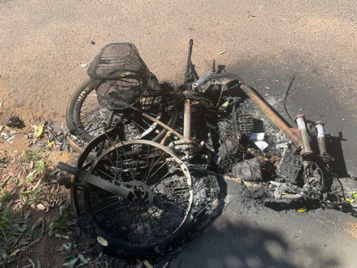 Moradores do bairro Jardim das Oliveiras, em Três Lagoas, foram surpreendidos na manhã desta sexta-feira, 24, ao encontrarem uma bicicleta elétrica totalmente queimada no cruzamento da rua Maria Guilhermina Esteves com a rua Santa Rita.