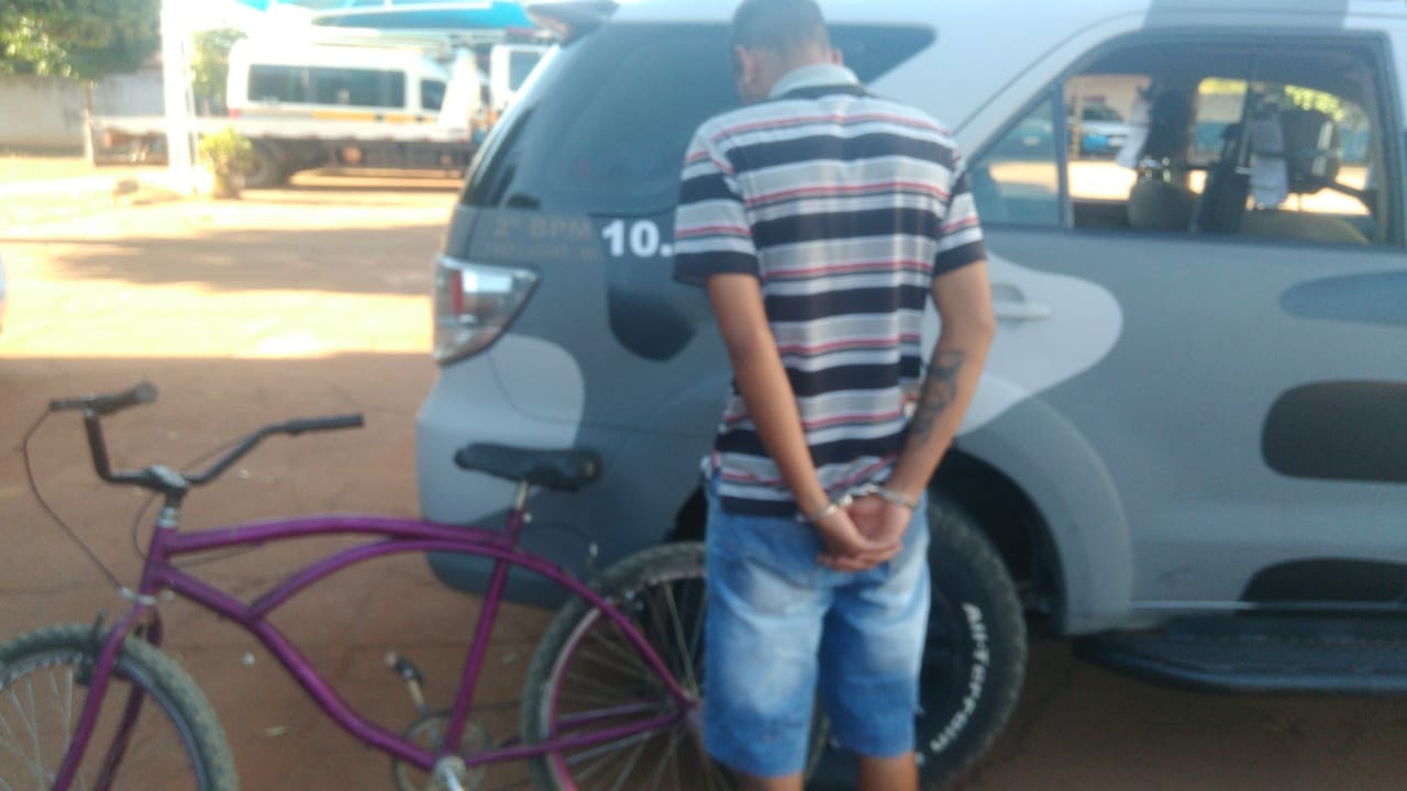 Durante rondas pelo bairro Jardim das Violetas a guarnição abordou o suspeito que trafegava com uma bicicleta Caiçara de cor roxa que depois de checada nos sistemas policiais constou ser produto de furto da data de 20/11/2017.